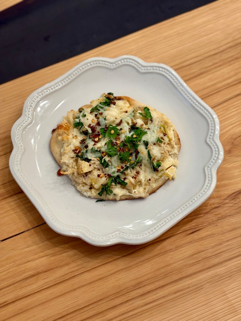 The real secret? A crispy flatbread loaded with grilled chicken, artichoke hearts, baby spinach, melty mozzarella, a sprinkle of parmesan, and a rich white garlic sauce that brings it all together.